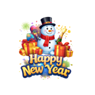 A colorful “Happy New Year” text design with fireworks, balloons, and gift elements. Ideal for New Year greetings, social media posts, banners, posters, and festive promotions.