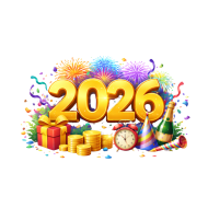A festive Happy New Year 2026 design with golden numbers, fireworks, gifts, coins, clock, and party elements. Suitable for New Year greetings, posters, banners, and promotional designs.