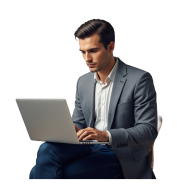 Download this high-quality PNG of a professional young man sitting and working on a laptop. Ideal for presentations, office-related designs, tech blogs, educational content, remote work promotions, or business websites.